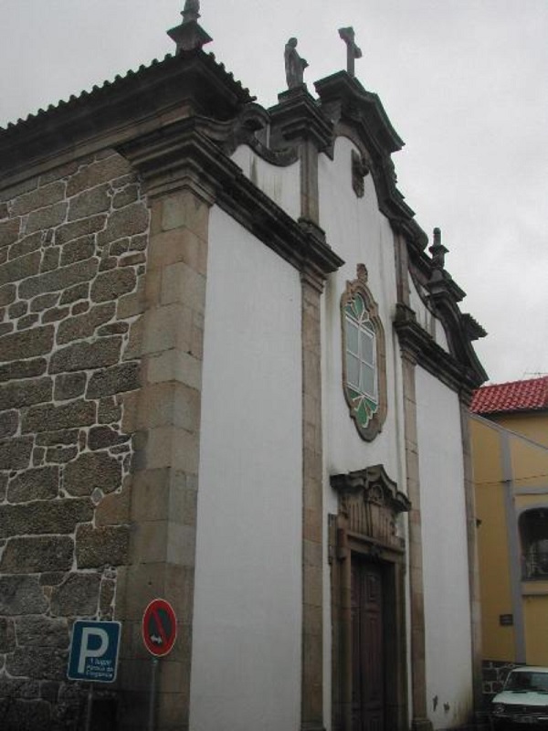 Na fachada principal, quatro pilastras definem os cunhais do edifício e a zona central, abrindo-se, nesta última, o portal, de moldura reta, rematado por frontão contra curvado e tímpano segmentado, encimado por uma concha. Um entablamento suporta o frontão do alçado, mas é interrompido, no pano central, onde se situa o janelão e a coroa, no eixo do portal.