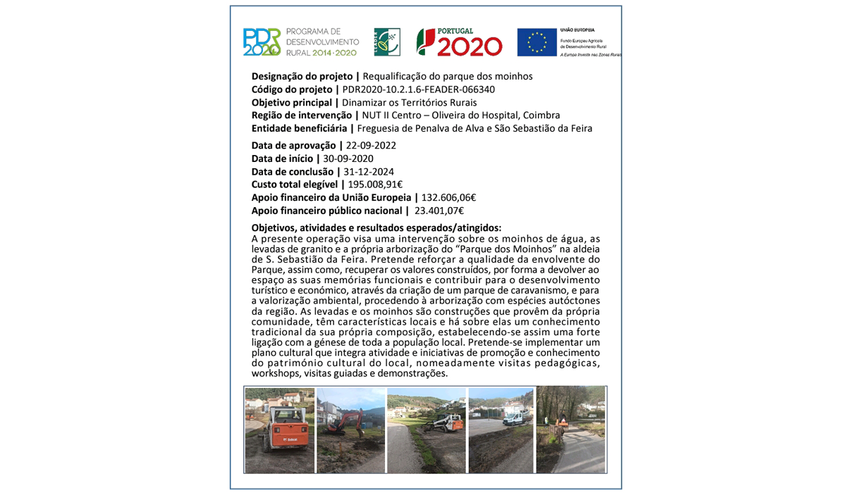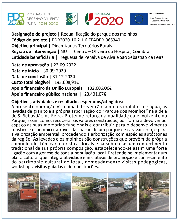 A presente operação visa uma intervenção sobre os moinhos de água, as levadas de granito e a própria arborização do "Parque dos Moinhos" na aldeia de S. Sebastião da Feira. Pretende reforçar a qualidade da envolvente do Parque, assim como, recuperar os valores construídos, por forma a devolver ao espaço as suas memórias funcionais e contribuir para o desenvolvimento turístico e económico, através da criação de um parque de caravanismo, e para a valorização ambiental, procedendo à arborização com espécies autóctones da região.